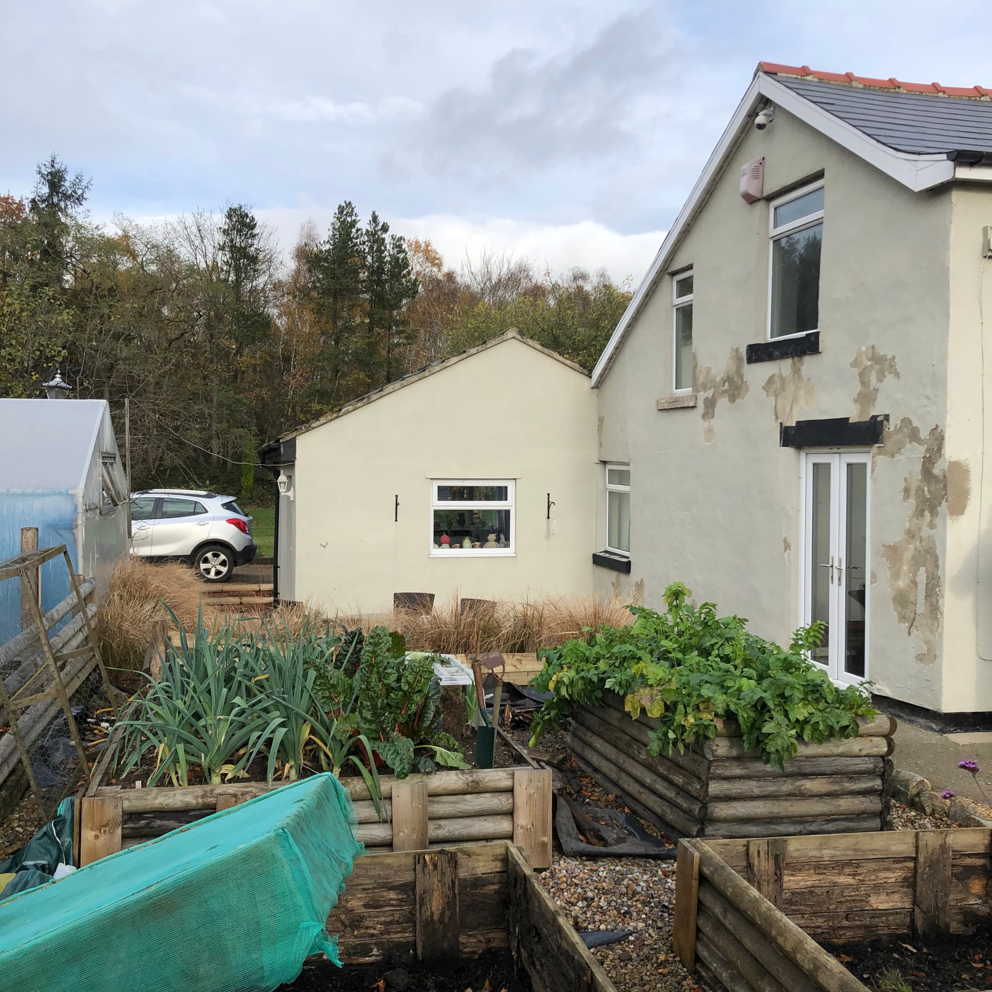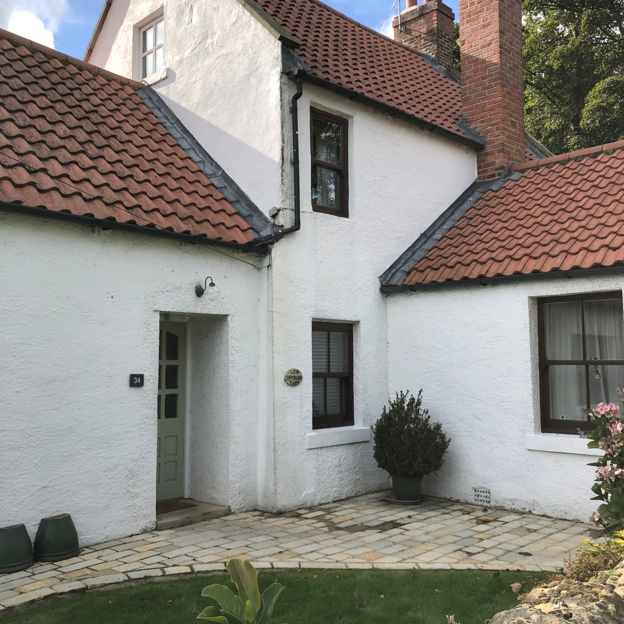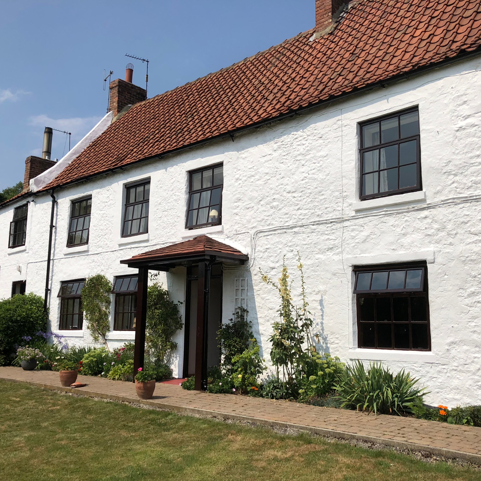 Exterior of farmhouse in Hartlepool. All walls finished in Johnstone’s Masonry Brilliant White, stain applied to all windows, doors and woodwork.