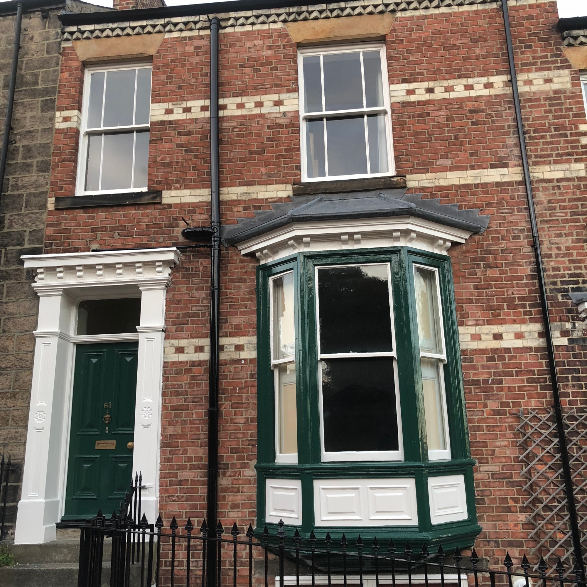 Exterior windows and doors in Durham City. Rotting wood replaced where required. All paintwork Dulux Weathershield Exterior Gloss.
