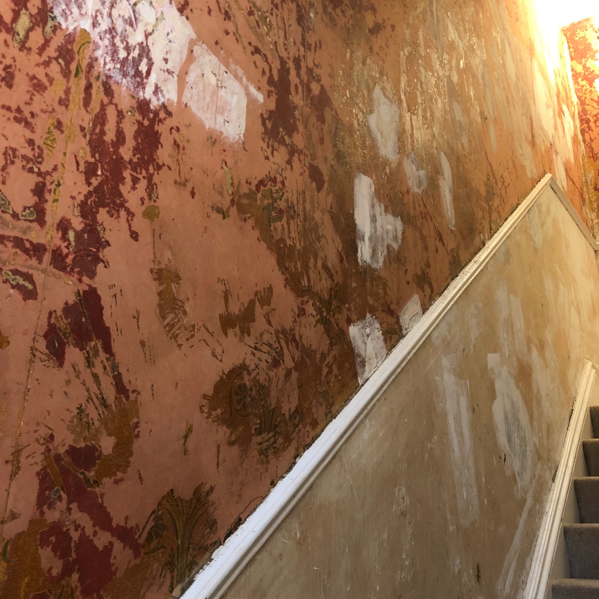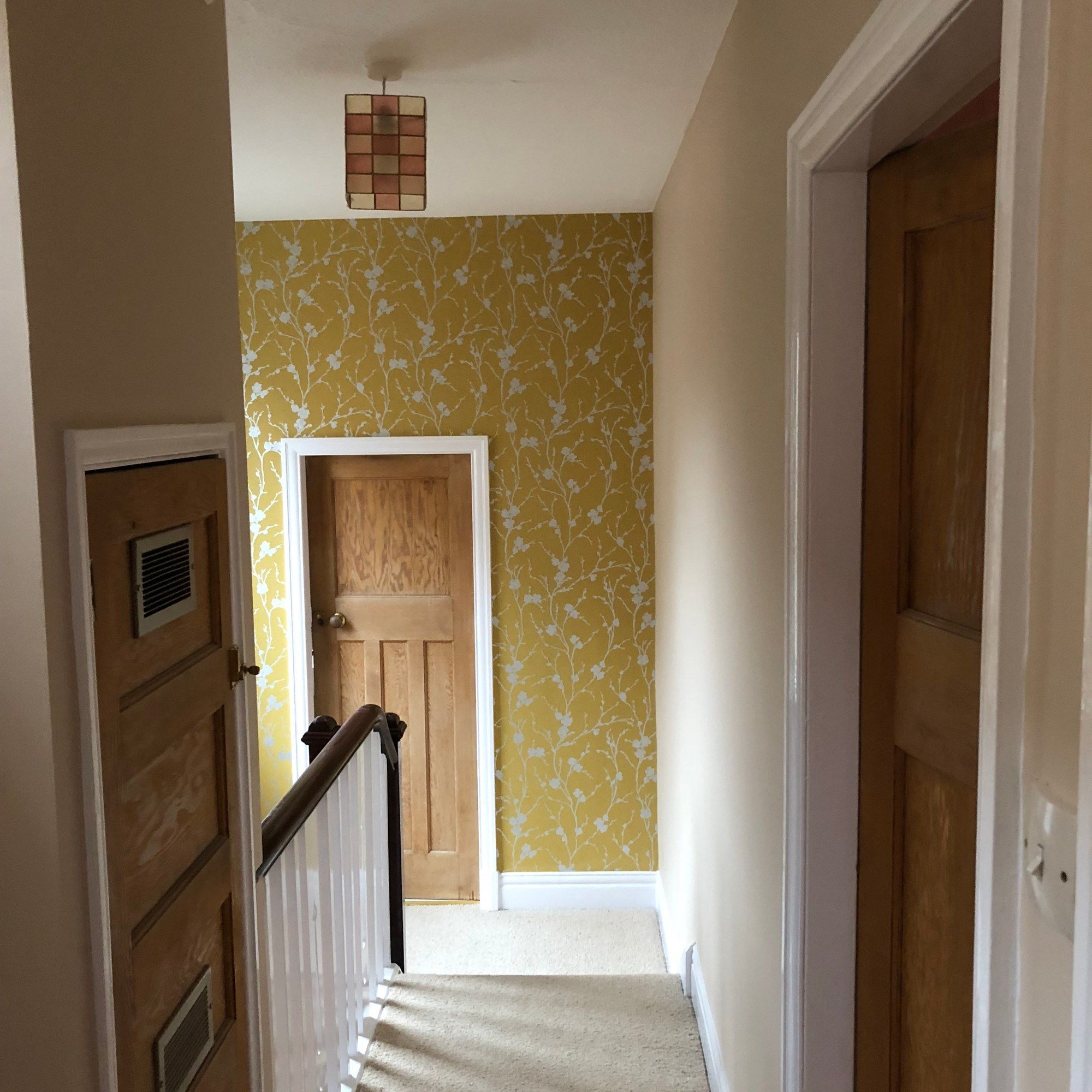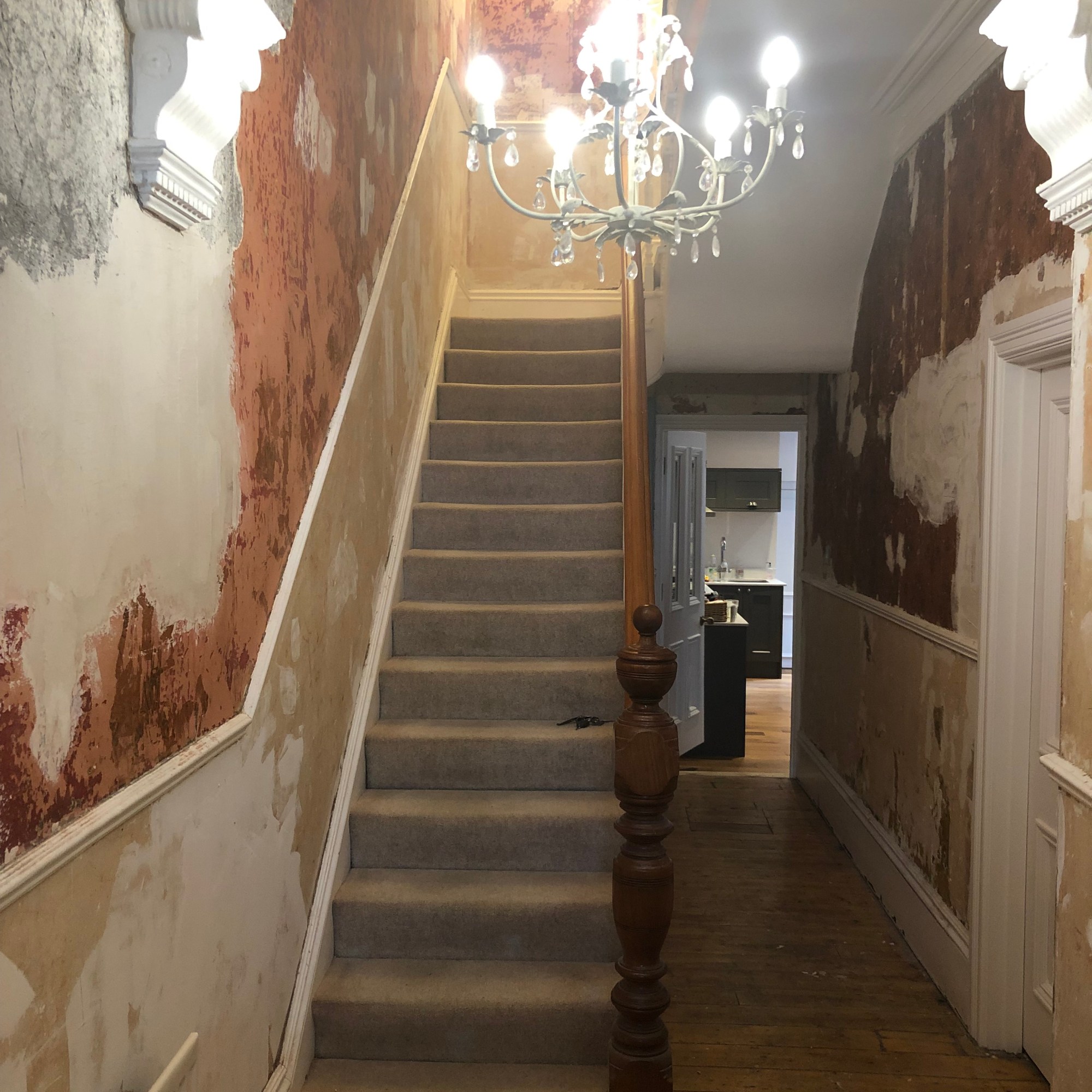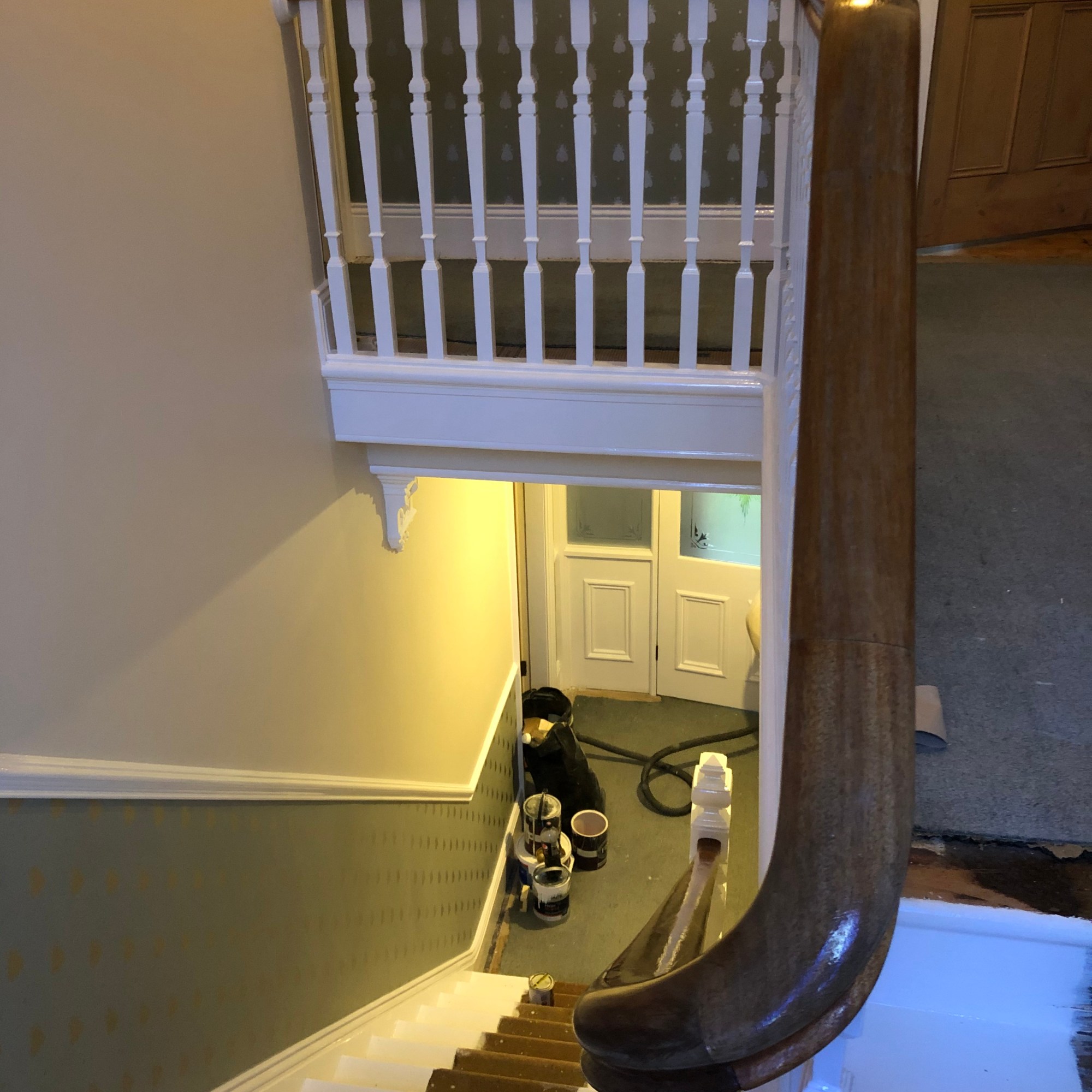 Hall, stairs and landing at a home in Gosforth. Wallpaper stripped back revealing original wallpaper. Walls fully lined and all walls and woodwork painted.