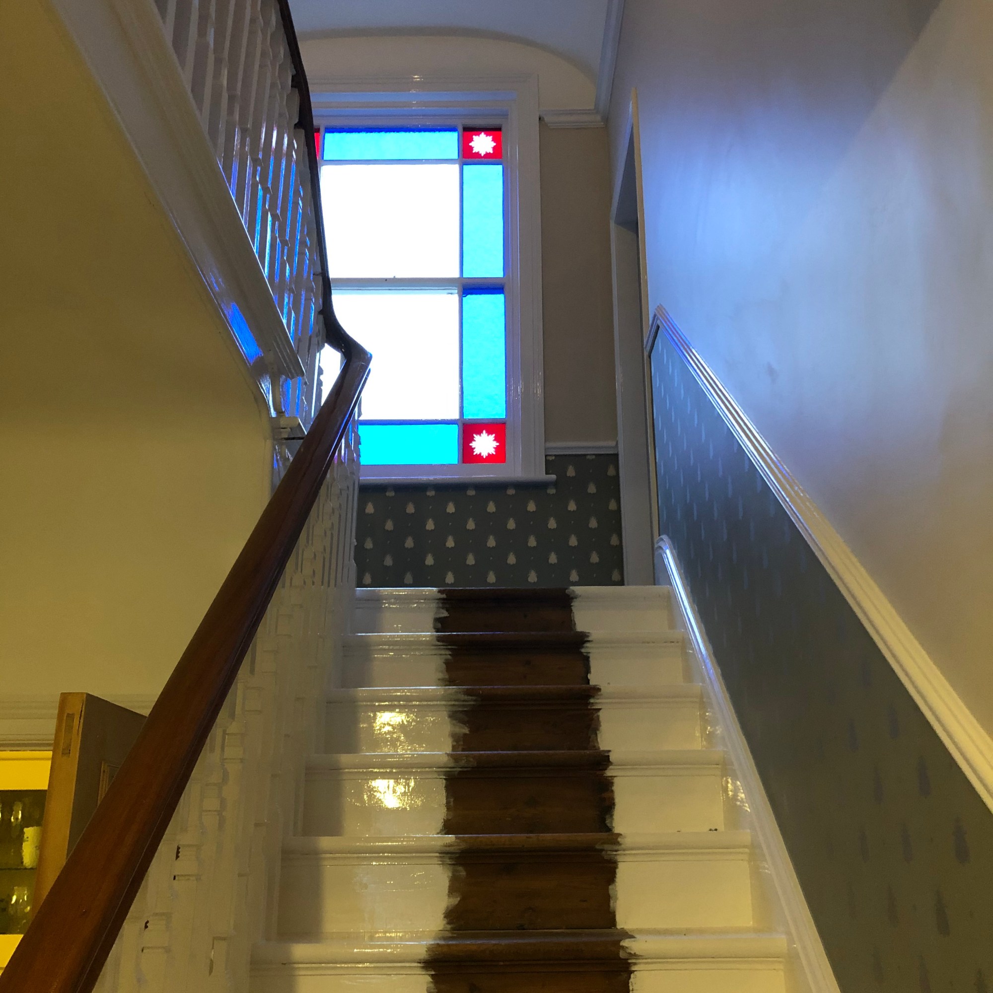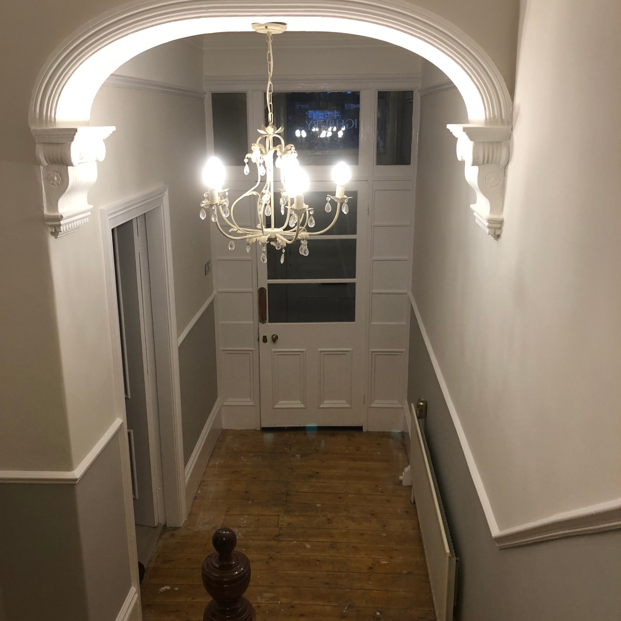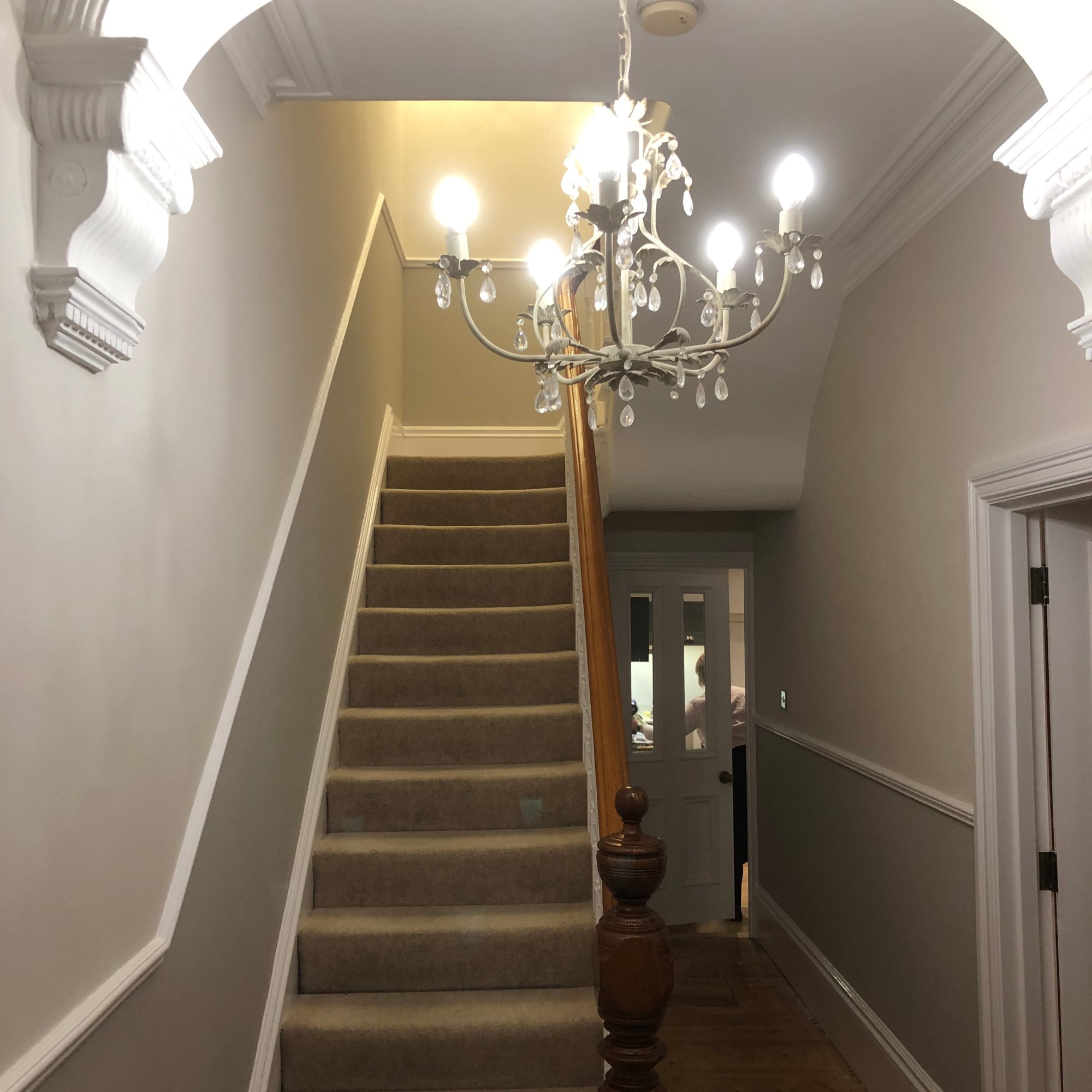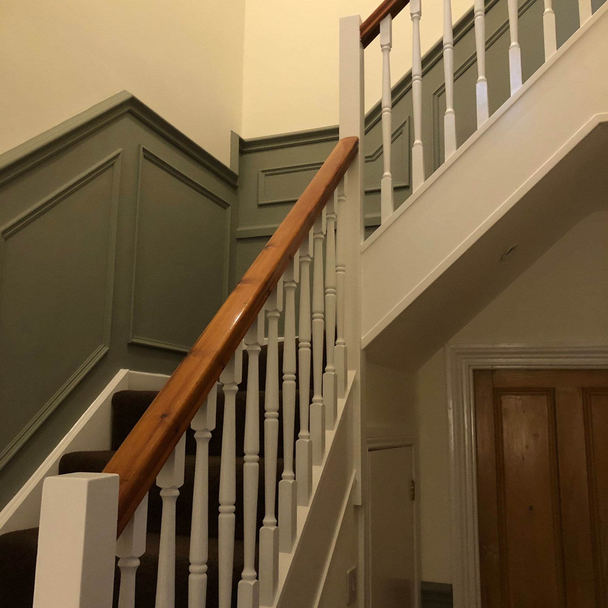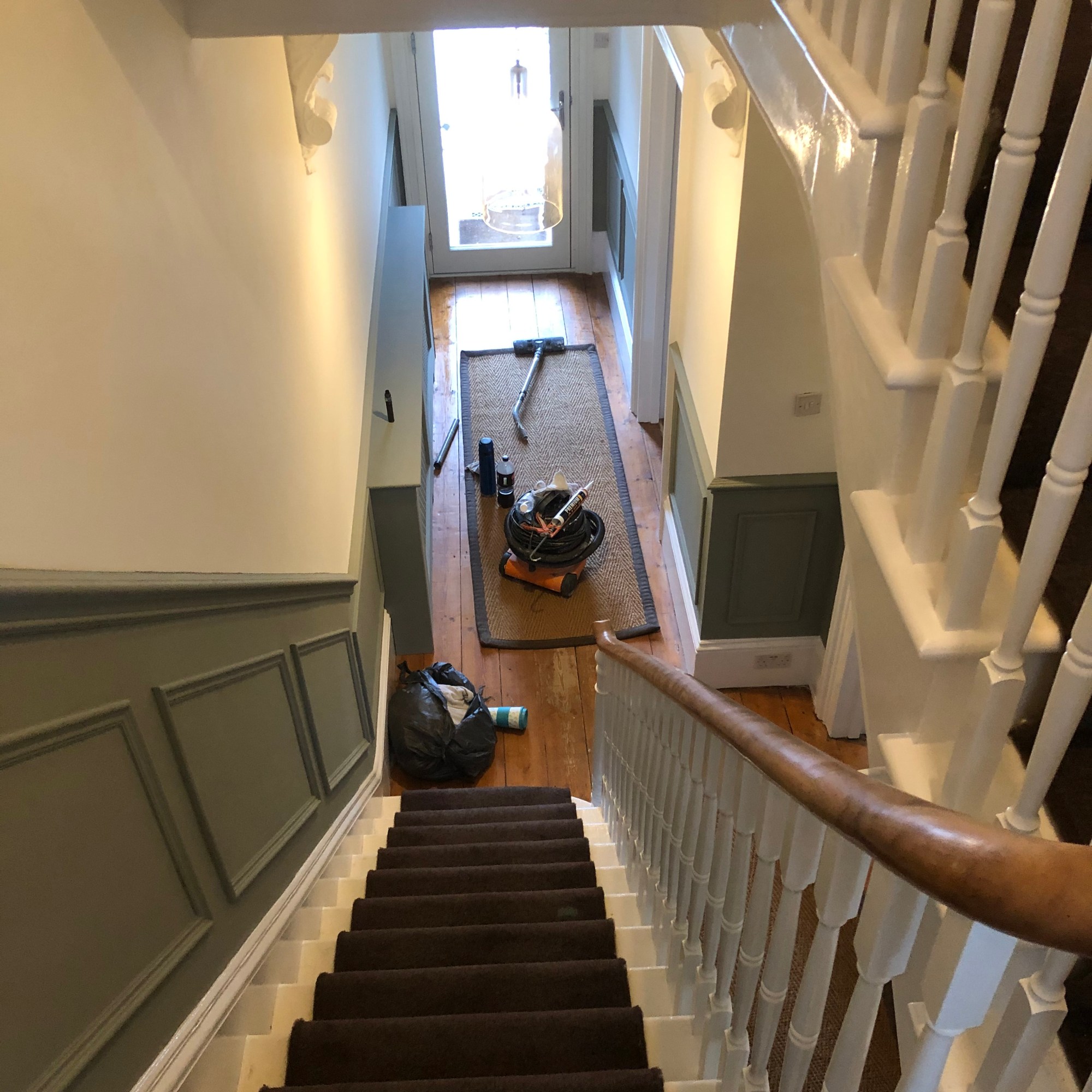Hall, stairs and landing at a home in Gosforth. Wallpaper stripped back revealing original wallpaper. Walls fully lined and all walls and woodwork painted.