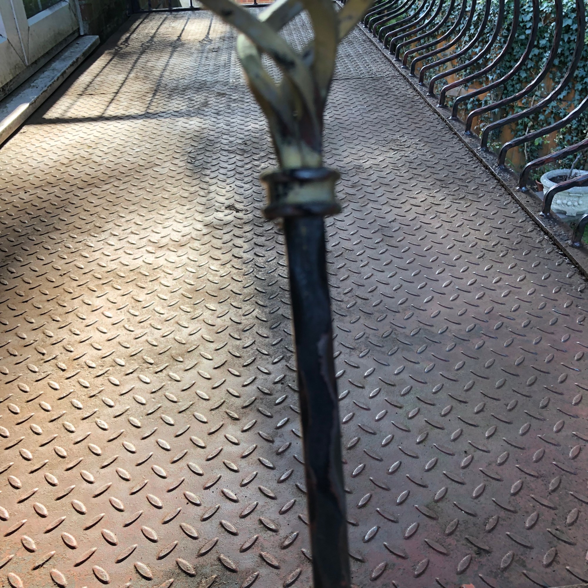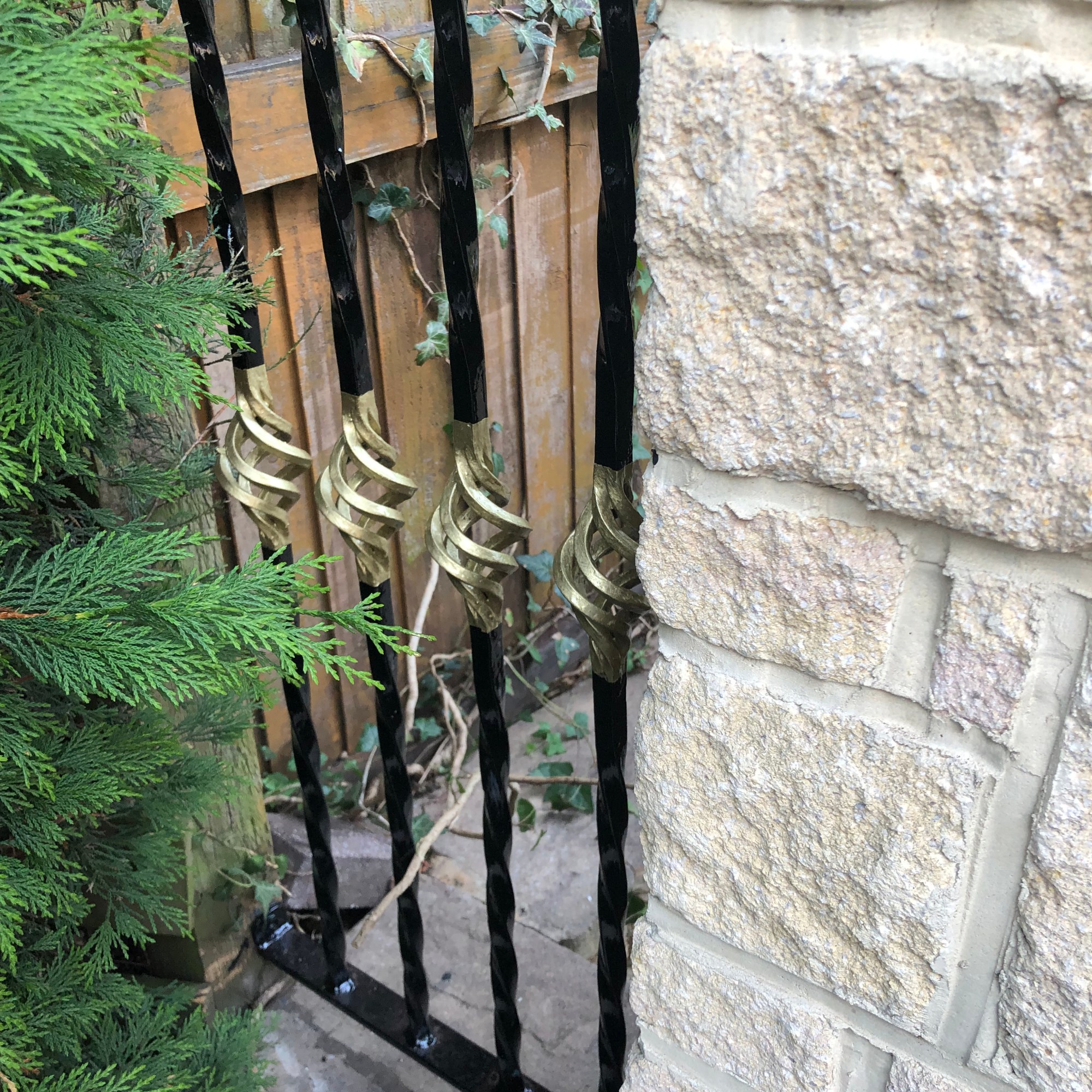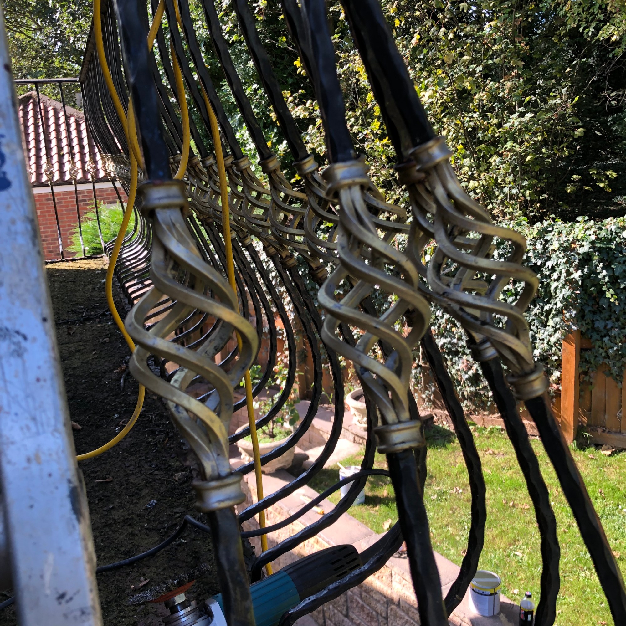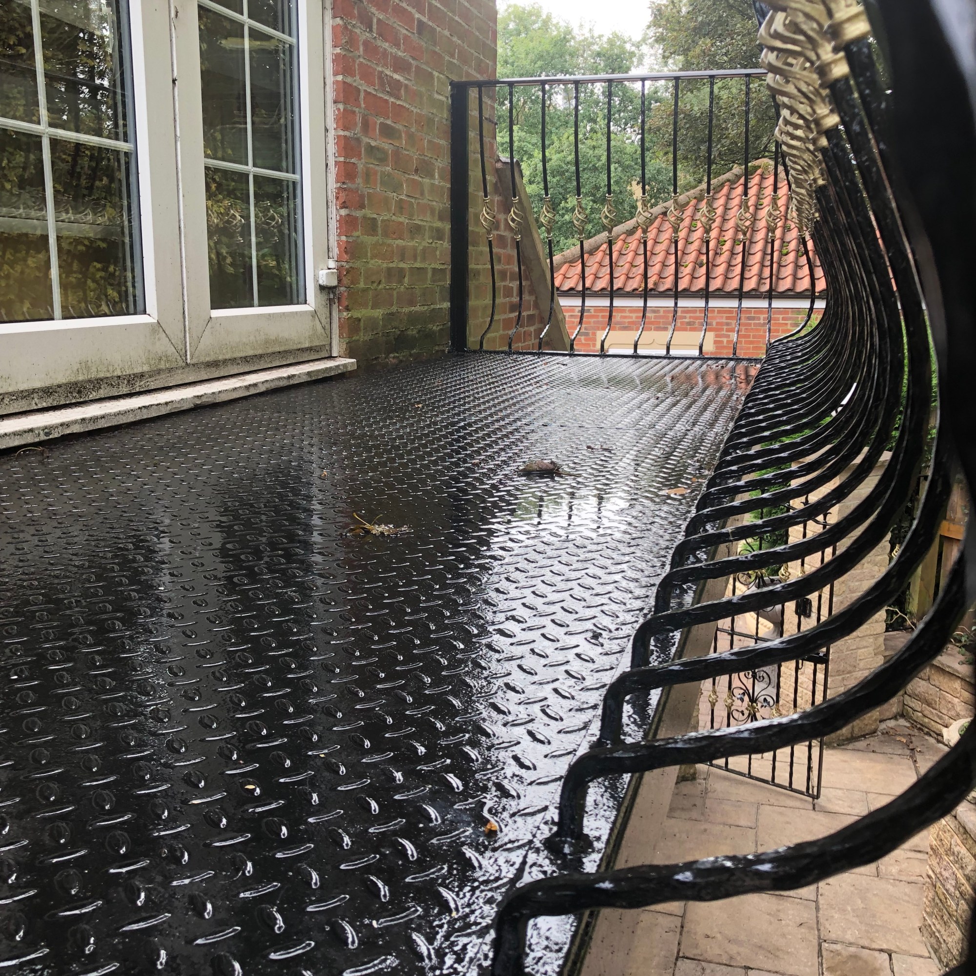 Exterior railings and balcony floor in Durham. Rust removed, anti-rust inhibitor applied followed by Dulux Weathershield in Black and Hammerite gold detailing.