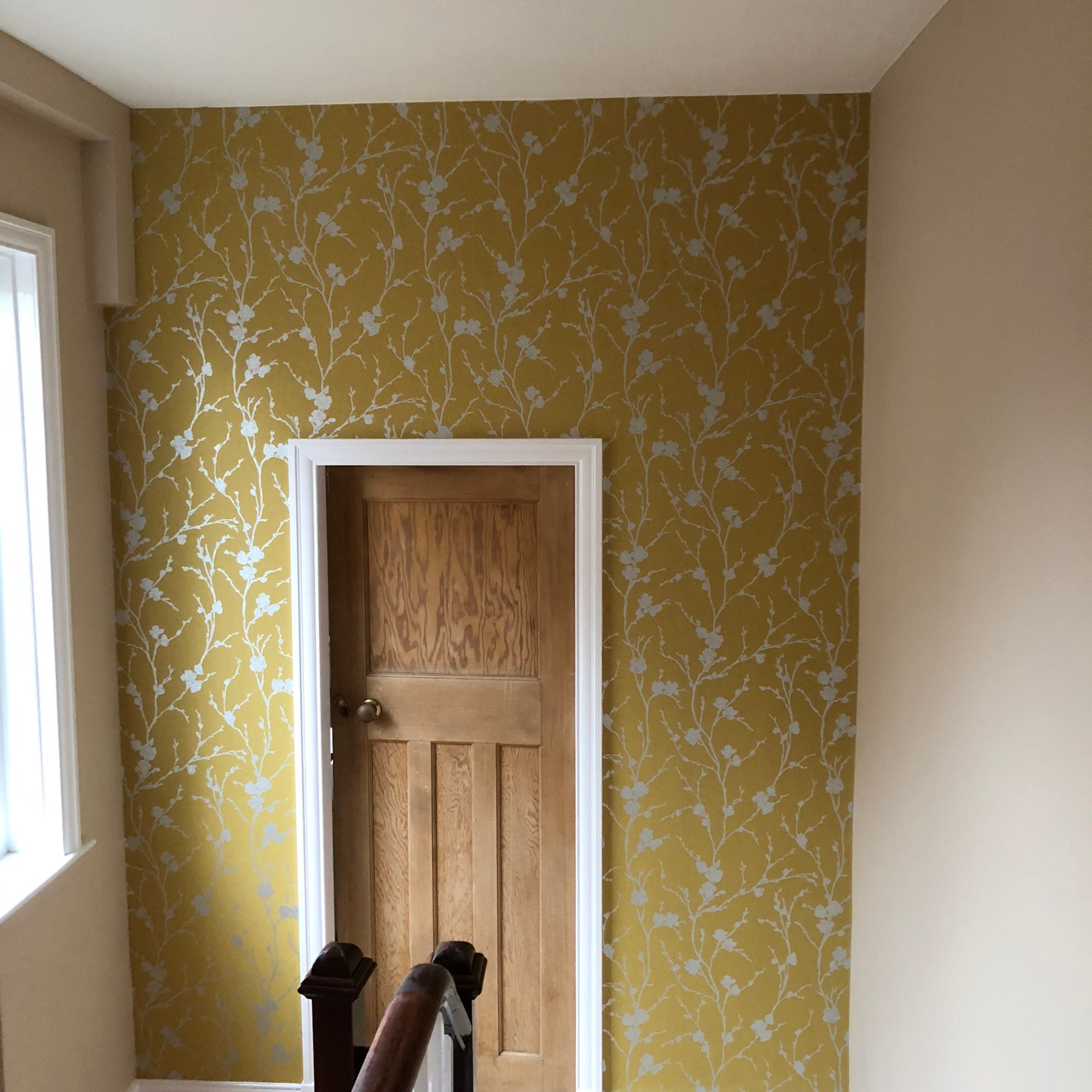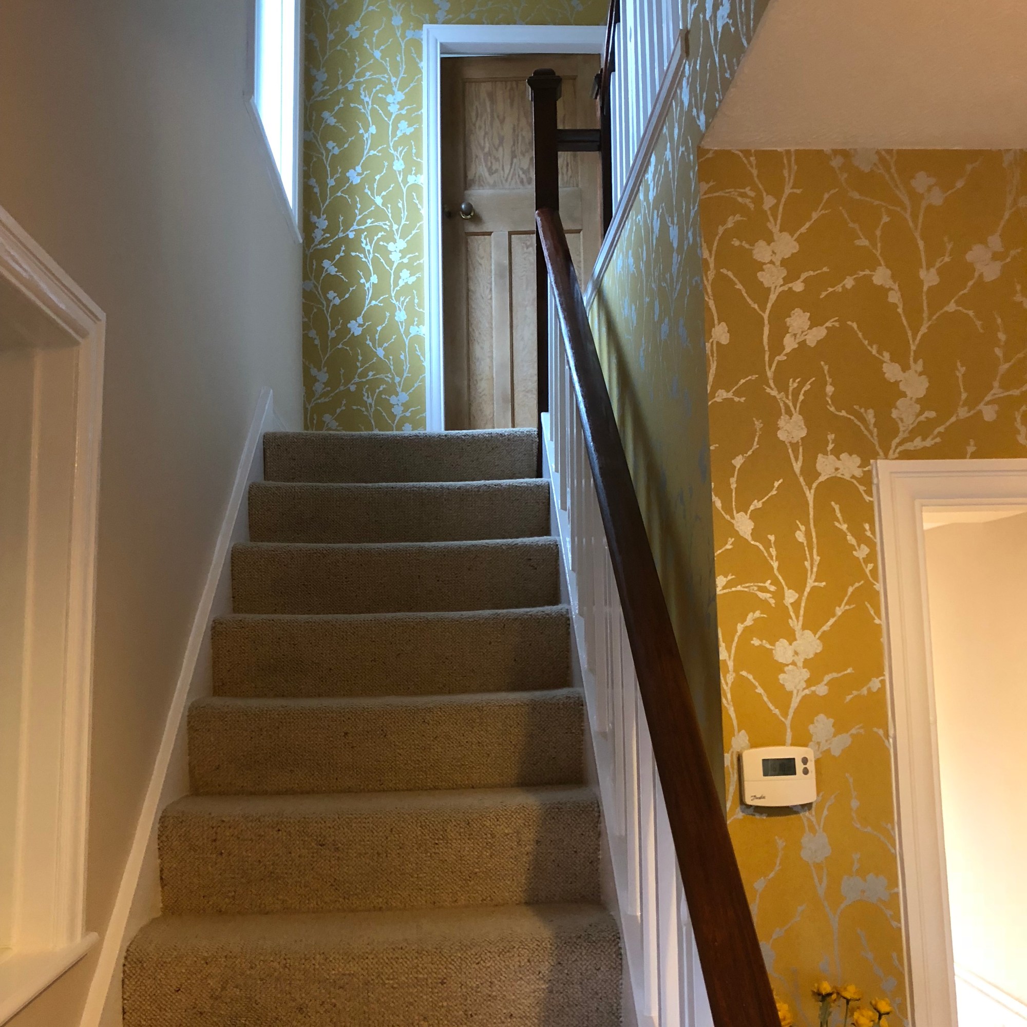 Hall, stairs and landing redecoration at a home in Durham City. Graham and Brown finish wallpaper applied to feature walls. Walls and woodwork painted.