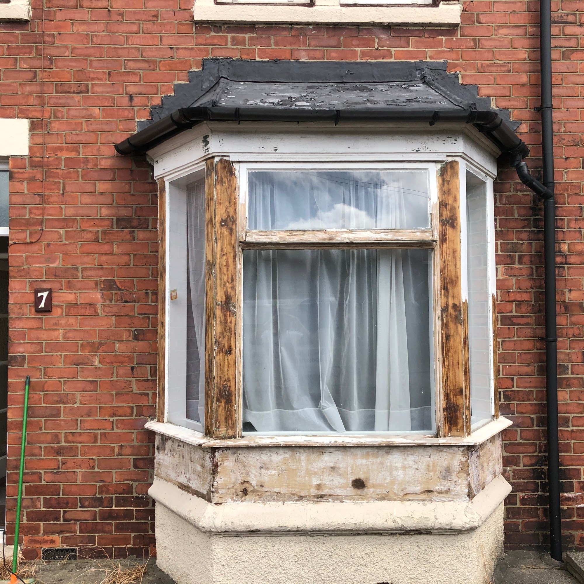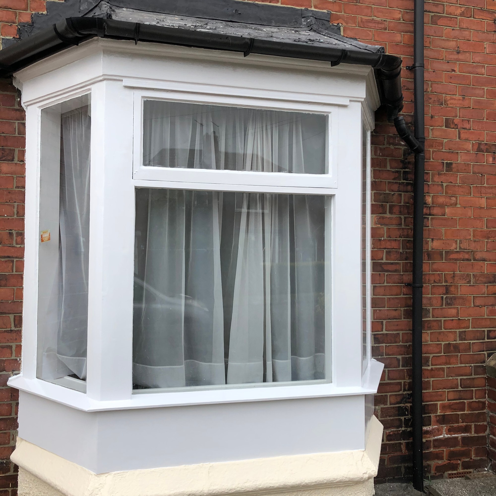 Exterior window frame in Durham City. Old flaking paint burnt off and finished off in Dulux Weathershield Brilliant White.