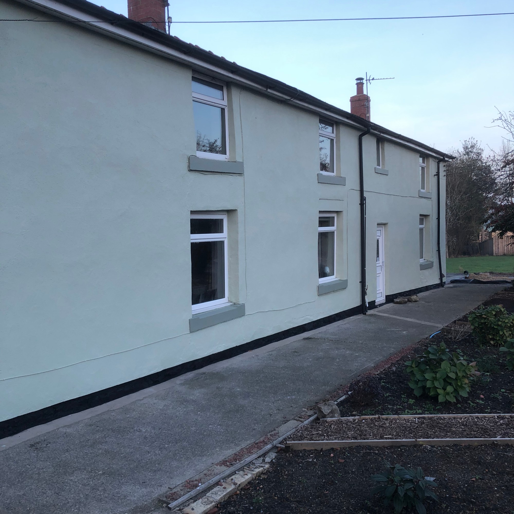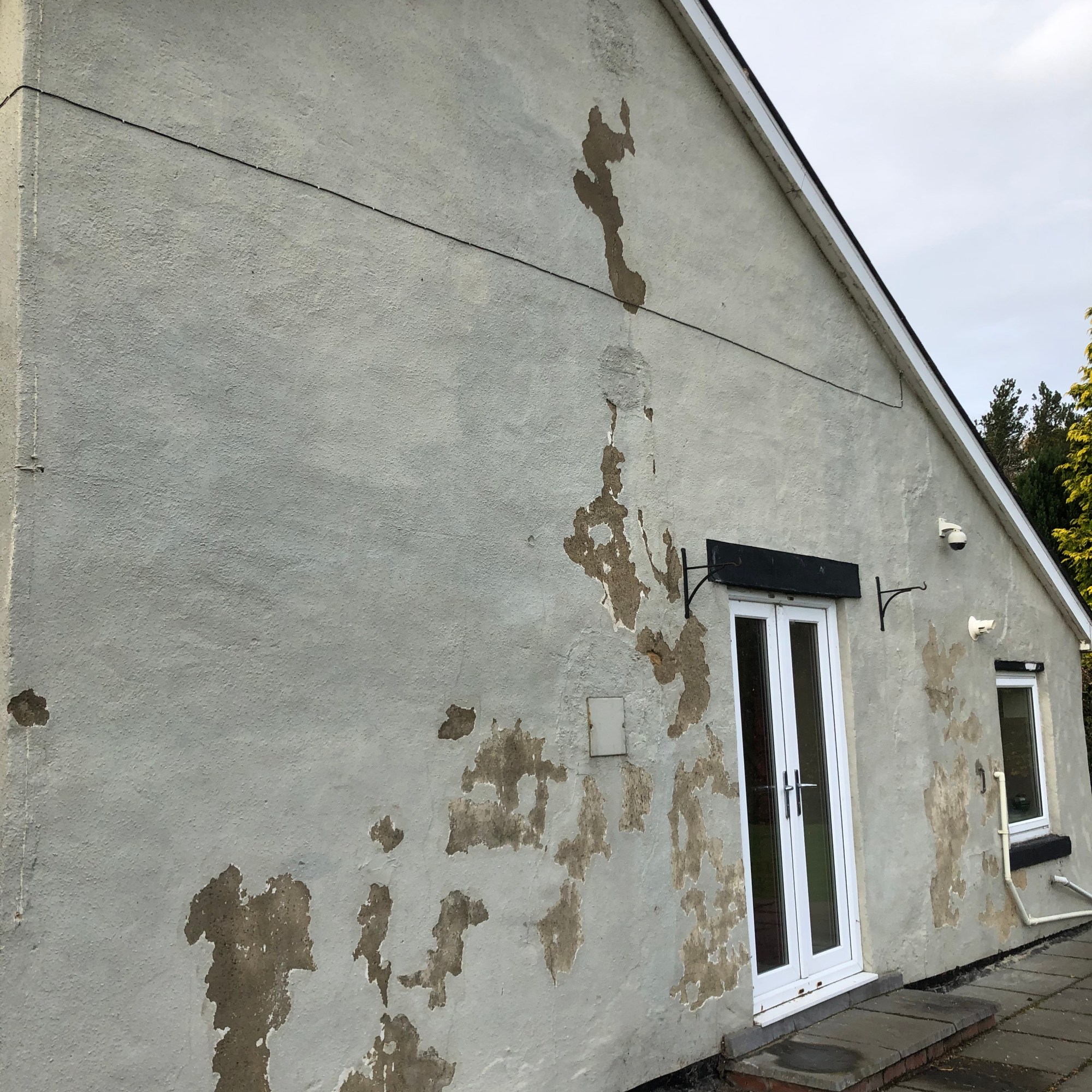 Exterior masonry, Willington. Stabilising and re-rendering as required and whole exterior repaint.