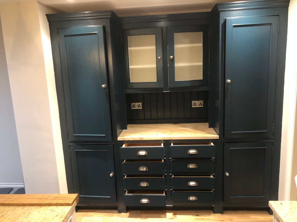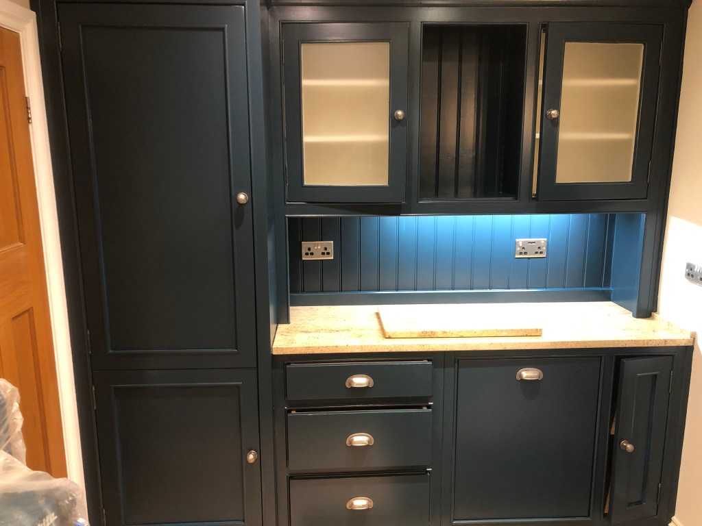 Hand painted kitchen units for a client in Gosforth. Cabinets painted in Farrow and Ball Hague Blue.